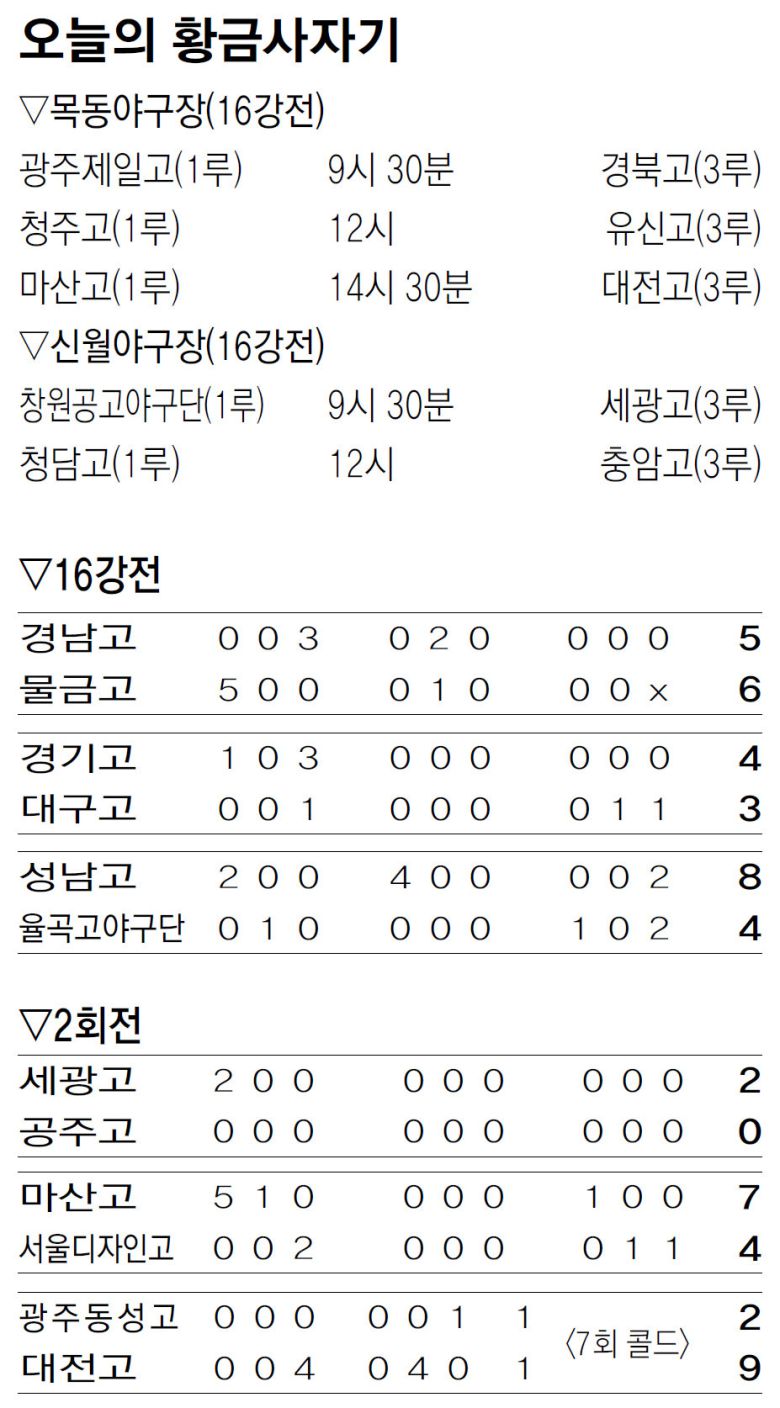 대회 전 프로 스카우트들로부터 우승 후보 1순위로 꼽혔던 대구고도 16강 문턱에서 고배를 마셨다. 대구고를 침몰시킨 팀은 1905년 창단해 국내 고교야구에서 가장 긴 역사를 자랑하는 경기고였다. 경기고 4번 타자 이동건(18)은 1회초, 3회초 연속 적시타를 치는 등 4타수 2안타 2타점으로 4-3 승리에 앞장섰다. 대구고는 9회말 이재준(18)의 희생플라이로 1점을 추가하며 한 점 차까지 추격했지만 이어진 2사 2, 3루에서 대타 양서진(18)이 3루 땅볼로 물러나면서 대회를 마무리했다. 경기고가 황금사자기 8강에 오른 건 준결승에 진출했던 2018년 대회 이후 7년 만이다. 경기고는 2000년 이후 25년 만의 우승에 도전한다.