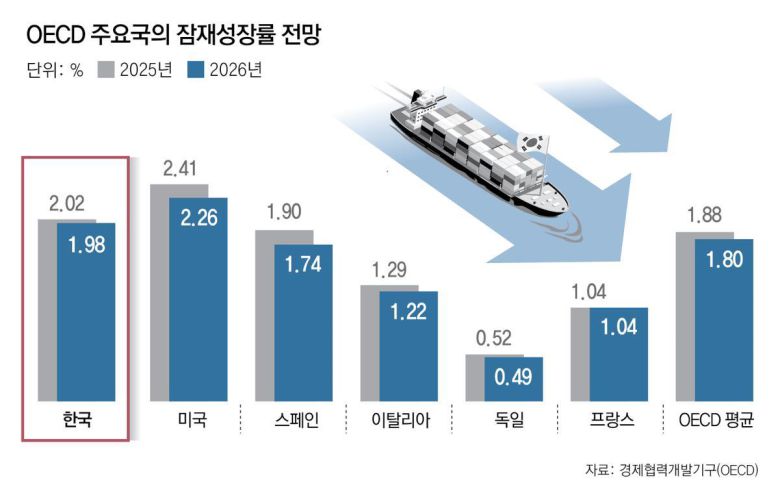 12일 OECD가 최근 업데이트한 경제전망(Economic outlook)에 따르면 내년 한국의 잠재성장률은 1.98%로 전망된다. 올해 잠재성장률 전망치(2.02%)보다도 0.04%포인트 낮은 수치다. 잠재 GDP는 한 나라의 노동·자본·자원 등 모든 생산요소를 완전히 동원하면서도 물가 상승을 유발하지 않고 달성할 수 있는 최대 생산 수준을 의미한다.