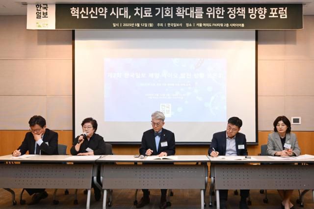 12일 서울 여의도 FKI타워에서 열린 한국일보 주최 '혁신신약 시대, 치료 기회 확대를 위한 정책 방향 포럼'에 참석한 패널들이 토론 발언을 하고 있다. 최주연 기자 |