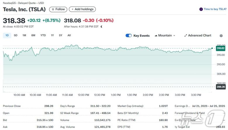 일단 테슬라는 6.75% 급등한 318.38달러를 기록했다. 이로써 시총이 1조250억달러로 불어 시총 1조달러를 재돌파했다. 이는 2월 24일 이후 약 3개월 만이다.