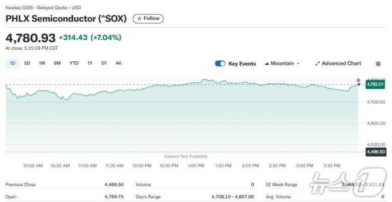 12일(현지시간) 뉴욕증시에서 반도체지수는 7.04% 급등한 4780.93포인트를 기록했다.
