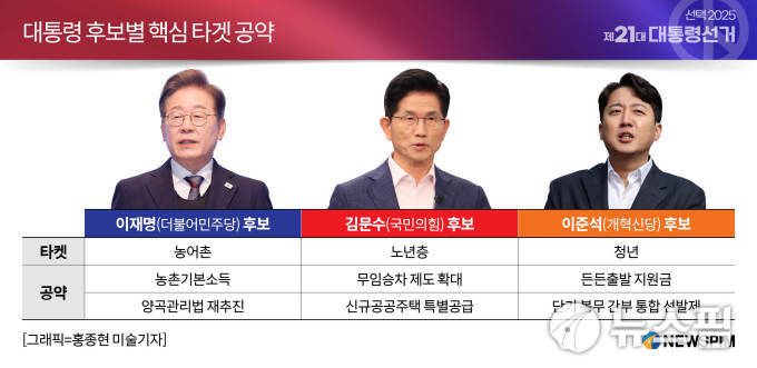 이재명 더불어민주당 대통령 후보는 '농어촌'을 콕 짚은 공약을 냈고, 김문수 국민의힘 대통령 후보는 '노년층', 이준석 개혁신당 대통령 후보는 '청년' 공약에 힘썼다.