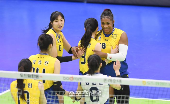 현대건설 모마가 11일 수원체육관에서 열린 2024~2025 V-리그 한국도로공사와 경기에서 서브로 득점을 얻은 후 동료들과 환호하고 있다.  2025. 2. 11.수원 | 최승섭기자 thunder@sportsseoul.com