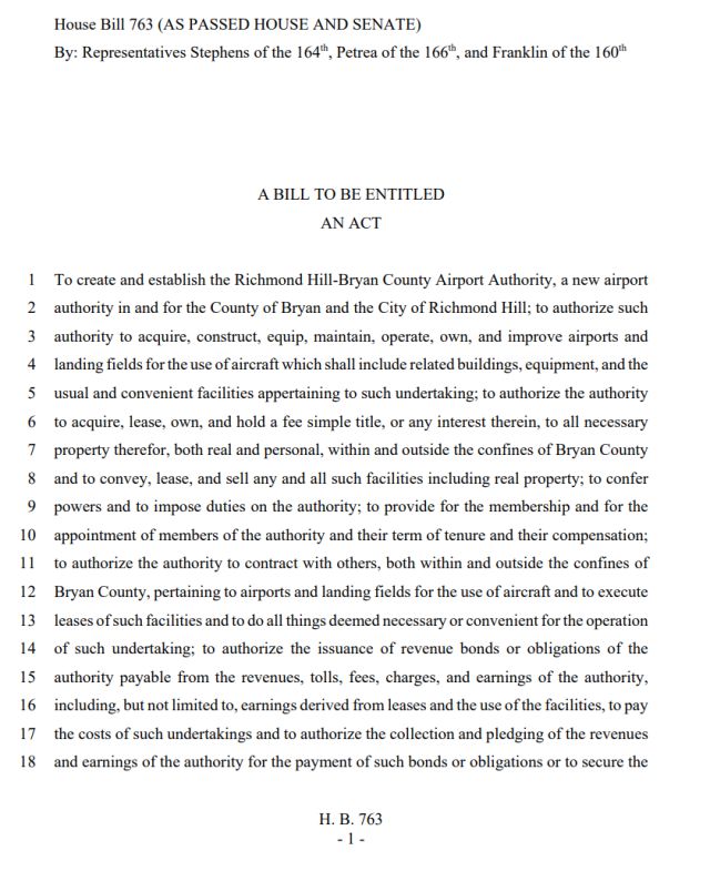 서울경제신문이 입수한 신공항 건설 법안 전문에는 “공항 건설을 위해 상충되는 사항은 다른 법률들에 우선한다”고 명시되어 있다. 이 법안의 효력은 캠프 주지사의 서명과 동시에 발효됐다. 조지아주는 즉각 ‘리치먼드힐·브라이언카운티 공항관리위원회’ 구성에 돌입했다. 위원회는 공항 건설을 위한 부지 매입과 시설 임대 및 건설 장비를 소유·운영할 수 있는 권한을 갖는다.