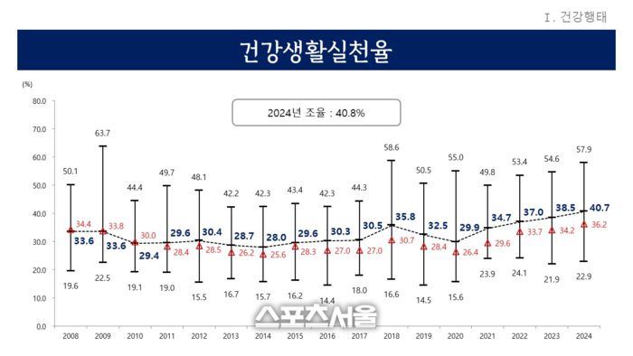 13일 경기도가 지난해 도내 48개 보건소에서 실시한 ‘2024년 지역사회건강조사’의 주요 결과에 따르면 금연, 절주, 걷기 모두를 실천한 복합지표인 ‘건강생활실천율’이 전국 중앙값 36.2%보다 4.5% 높은 40.7%로 나타났다.