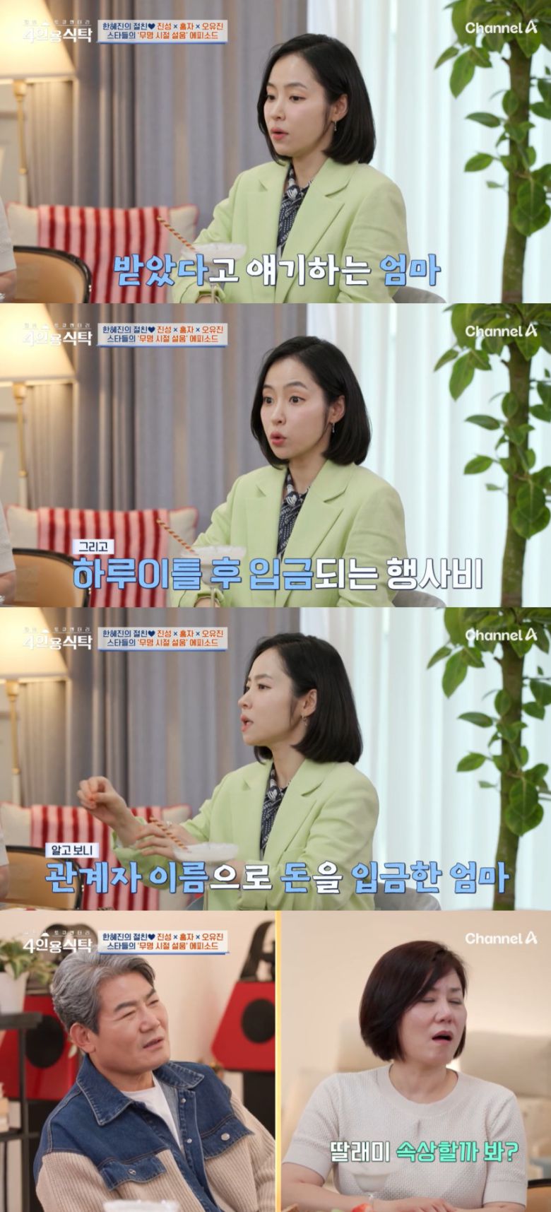 12일 오후 방송된 채널A '절친 토큐멘터리 - 4인용식탁'은 한혜진의 집에 방문한 진성, 홍자, 오유진의 이야기가 방송됐다. 한혜진은 진성에 대해 "34년이라는 긴 세월을 지켜준 든든한 지원군"이라고 평했고 홍자와 오유진은 한혜진에 대해 "가수 생활에 있어서 없어서는 안 될 롤 모델이자 선배님이다"라고 전했다.