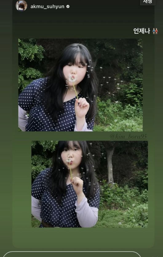 김보라는 이수현이 12일 자신의 인스타그램에 올린 사진을 본인 계정에 리그램 하며 남다른 우정을 뽐냈다. 귀엽게 민들레 홀씨를 불고 있는 이수현의 모습에 “언제나”라는 짧은 메시지와 손 꼭 잡고 있는 이모티콘을 더해 눈길을 끌었다.