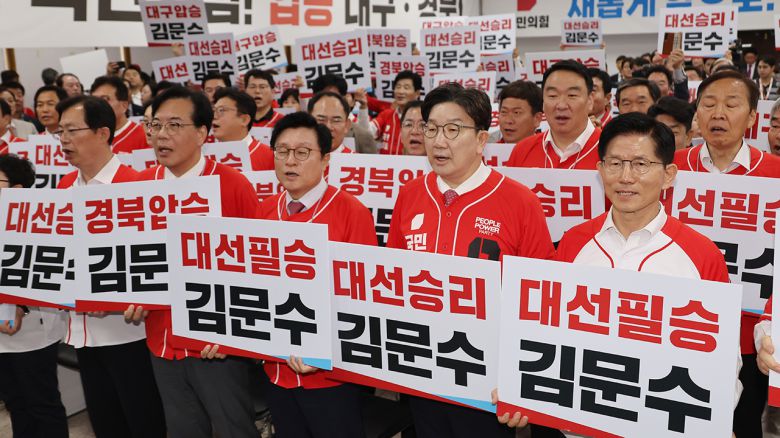 ▲ 국민의힘 김문수 대선 후보가 13일 국민의힘 대구시당에서 열린 대구경북 선대위 출정식 및 임명장 수여식에서 피켓팅을 하고 있다.