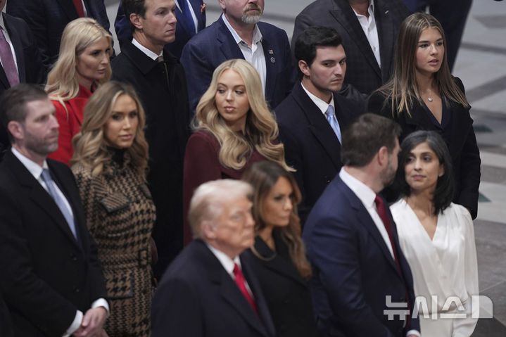 [워싱턴=AP/뉴시스]지난 1월21일(현지시각) 워싱턴의 내셔널 성당에서 열린 기도회에 참석한 트럼프 일가. 어깨를 넘는 긴 머리 등 여성들의 스타일이 특징적이다. 2025.5.13.