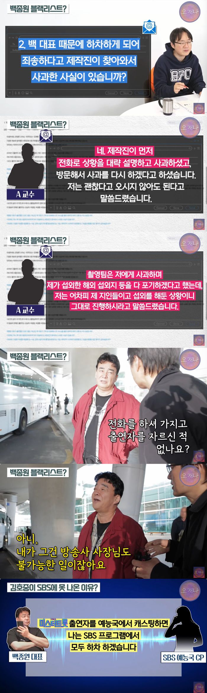이 외에도 김재환 PD는 백종원은 자신이 직접 출연하지 않는 프로그램에도 그 교수에 대해 출연자 하차에 개입했다는 주장과 증거를 내세웠다.