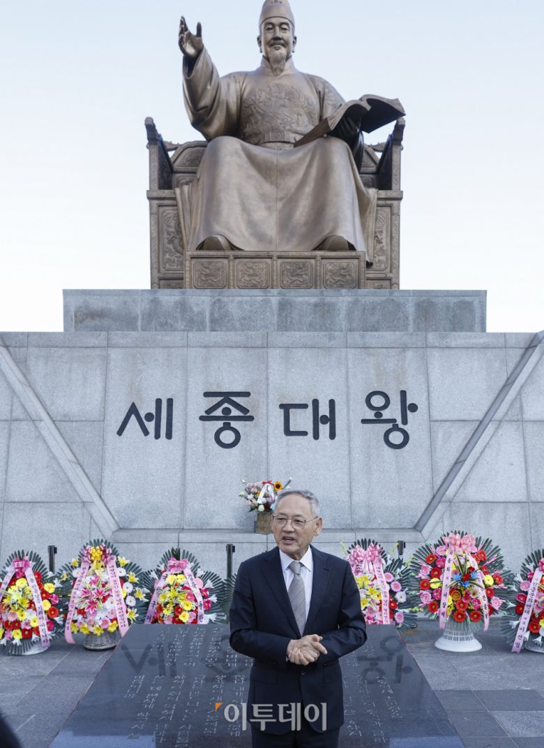 유인촌 문화체육관광부 장관이 지난해 10월 서울 종로구 광화문광장 세종대왕 동상 앞에서 열린 세종대왕께 꽃 바치기 행사에서 인사말을 하고 있다. 이날 행사에는 유 장관과 김주원 한글학회장, 최홍식 세종대왕기념사업회장 등 25명이 참석했다. 조현호 기자 hyunho@