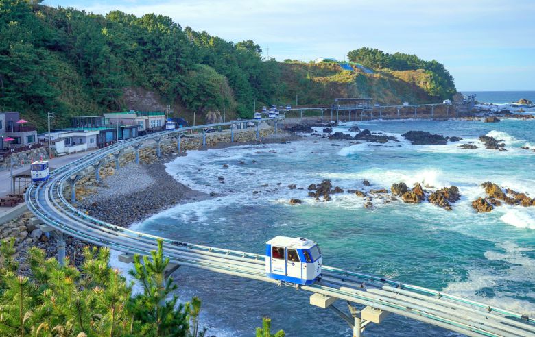 울진 바다의 명물인 하트해변, 드라마 ‘폭풍속으로’ 세트장, 죽변등대를 지나는 죽변스카이레일은 2.8㎞ 코스로, 느리게 이동하는 모노레일 아래로 파도가 철썩이는 이색 체험을 선사한다.