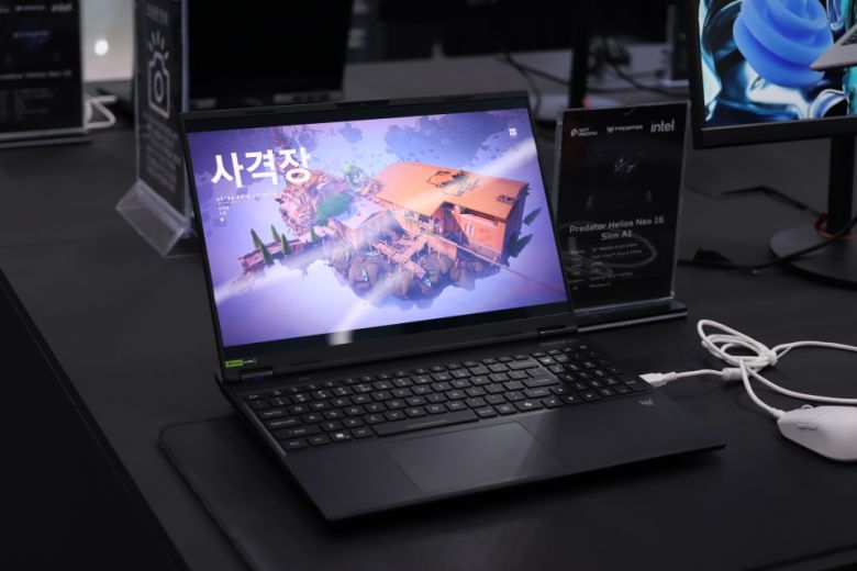 '에이서 프레데터 헬리오스 네오 16 AI'의 슬림 모델인 '에이서 프레데터 헬리오스 네오 16 슬림 AI'의 스펙도 막강하다. 현장에 전시된 모델 기준으로 인텔 코어 울트라 9 275HX 프로세서에 지포스 RTX 5070 Ti와 240Hz OLED 디스플레이가 적용됐다.