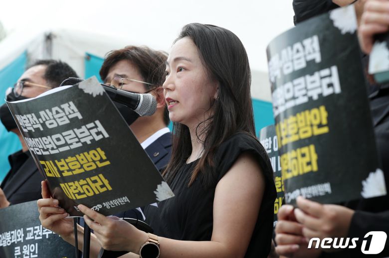 한국교원단체총연합회(한국교총)가 2023년 7월 27일 서울 영등포구 여의도 국회의사당 앞에서 '교권보호 대책 마련 촉구' 기자회견'을 하고 있다. 2023.7.27/뉴스1 ⓒ News1 민경석 기자 |