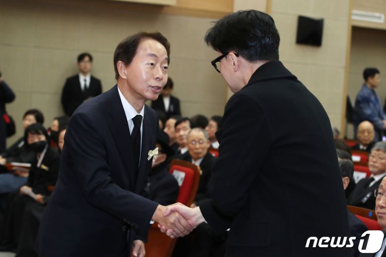 김현철 김영삼대통령기념재단 이사장이 11일 오전 서울 동작구 국립서울현충원에서 엄수된 김영삼 전 대통령의 부인 고 손명순 여사의 영결식에 한동훈 국민의힘 비대위원장과 인사나누고 있다.2024.3.11/뉴스1 ⓒ News1 이광호 기자 |