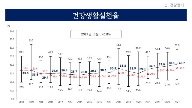 먼저 금연, 절주, 걷기 모두를 실천한 복합지표인 ‘건강생활실천율’이 전국 중앙값 36.2%보다 4.5% 높은 40.7%로 나타났다. 이는 지역사회건강조사를 실시한 2008년 이후 역대 최고치다. 경기도의 건강생활실천율은 2014년 28%로 낮아졌다가 2023년 38.5%로 최고치를 기록한 이후 1년 만에 다시 갱신했다. 시군별로는 과천시 57.9%, 성남시 분당구 56.5%, 용인시 수지구 54.7% 순으로 높은 수치를 나타냈다.