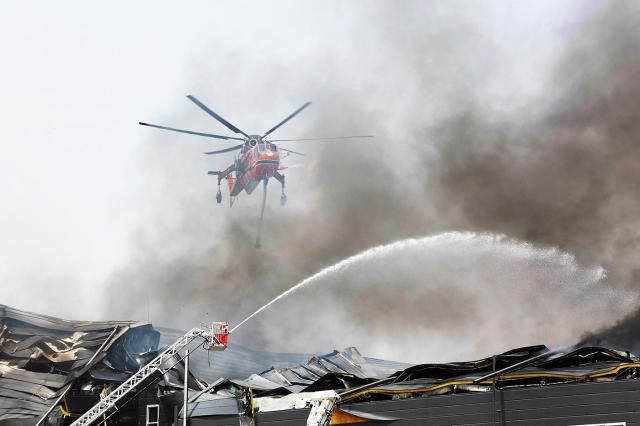 13일 경기도 이천시 부발읍 소재 대형 물류센터에서 불이 나 소방헬기가 진화작업을 하고 있다. [사진=연합뉴스] |
