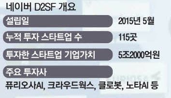 네이버 D2SF는 투자 후 자금 회수를 노리는 재무 투자와 달리 인공지능(AI), 로보틱스, 헬스케어, 커머스 등 네이버 핵심 사업과 시너지를 낼 수 있는 잠재력을 가진 초기 단계 스타트업에 투자하는 것이 특징이다.