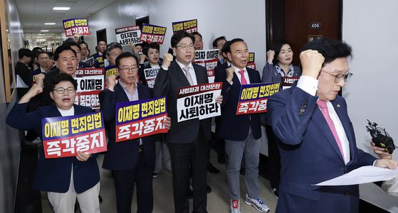 국민의힘 권성동 원내대표와 의원들이 7일 국회 법제사법위원회 전체회의장 복도에서 대통령 당선시 진행 중인 형사재판을 정지하도록 하는 내용의 형사소송법 개정안 처리에 항의하며 구호를 외치고 있다. 임현동 기자.