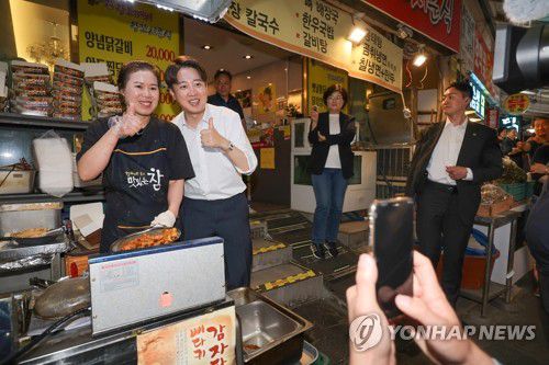 (대구=연합뉴스) 류영석 기자 = 개혁신당 이준석 대선후보가 13일 대구 칠성시장에서 상인과 사진을 찍고 있다. 2025.5.13