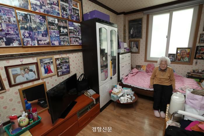 Lee Ok-seon sits in her room at the House of Sharing in Gwangju, Gyeonggi Province, in March 2019. The Kyunghyang Shinmun file photo |