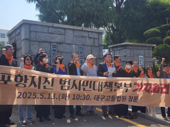 13일 오전 포항지진범시민대책본부가 대구고법 앞에서 항소심 재판부의 원고 패소 판결에 항의하는 기자회견을 열고 있다. 2025. 05. 13. 대구 민경석 기자
