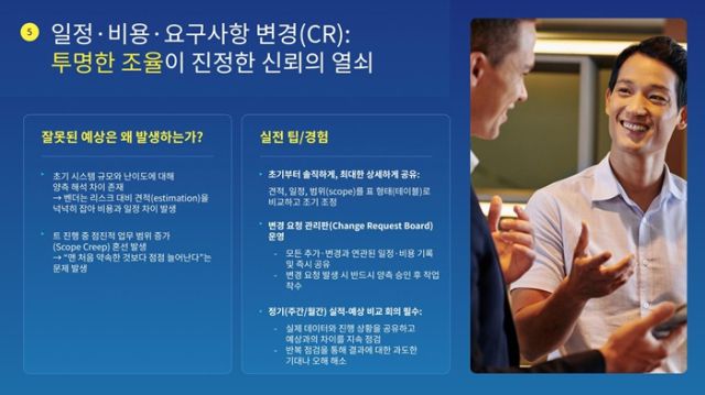 여섯 번째는 상호 검증(Cross-Test) 체계의 구축이다. 품질 관리 및 테스트(QA)는 외부 업체에만 전적으로 의존하는 것을 지양하고, 현장 테스트 및 인수 담당자를 명확히 지정해 결과물을 꼼꼼히 검토하는 상호 검증 체계 구축이 강조된다.