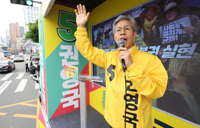 ▲민주노동당 권영국 대선 후보가 13일 오전 서울 성북구 성신여대입구역 인근에서 선거유세차에 올라 지지를 호소하고 있다. ⓒ연합뉴스