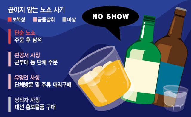 13일 경찰에 따르면 최근 연예인 소속사나 방송사 촬영팀을 사칭해 자영업자에게 주류 대리 구매를 시킨 뒤 금전을 편취하는 형식의 노쇼 사기가 전국 각지에서 기승을 부리고 있다. 경기 부진으로 매출난에 시달리고 있는 자영업자들의 절박한 심리를 이용해 유명인 방문과 단체 방문이라는 매력적인 조건을 미끼로 사기 행각을 벌이는 것이다.