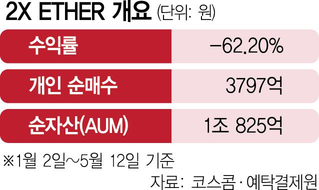 13일 코스콤에 따르면 올해 들어 이더리움 레버리지 ETF인 ‘2X ETHER’ 수익률은 -62.20%로 급락했다. 도널드 트럼프 미국 대통령 취임을 전후해 불확실성이 커지면서 위험자산을 회피하려는 심리의 영향으로 이더리움 가격이 떨어지자 일일 수익률을 2배 추종하는 해당 상품도 하락세를 면하지 못한 것이다.