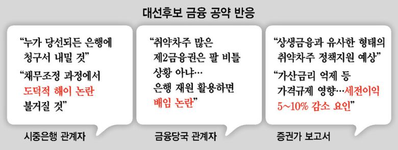 이런 까닭에 금융권에선 상당수 재원이 결국 금융업권에서 나오는 것 아니냔 의구심이 나온다. 한 시중은행 고위 관계자는 “누가 당선되든 은행에 청구서를 내밀 것”이라며 “정책 취지에는 공감하지만, 과도한 요구로 금융업의 본질이 훼손되는 일은 없기를 바란다”고 말했다. 다른 은행 관계자는 “채무조정이나 탕감이 과도하게 이뤄지거나 지원 대상 가려내기가 허술하면 또 다른 부작용을 낳을 수 있다”고 말했다.