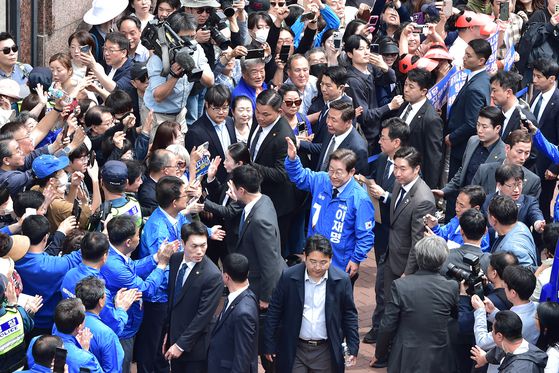 이재명 더불어민주당 대선 후보가 13일 오후 대구 중구 동성로에서 열린 집중 유세에서 지지자들에게 인사하고 있다. 김성룡 기자 |