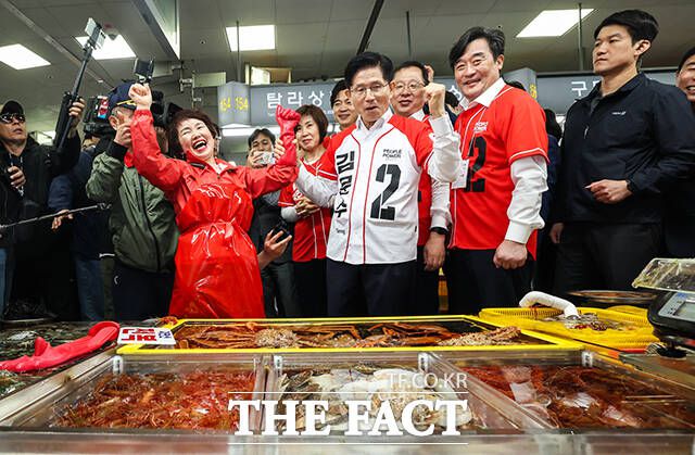 [더팩트ㅣ부산=임영무 기자] 김문수 국민의힘 대선 후보가 공식 선거운동 이틀째인 13일 오후 부산 자갈치 시장 유세를 마친 뒤 시장 상인의 응원을 받고 있다.