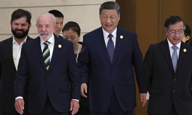 13일(현지시간) 중국 베이징에서 열린 중국-라틴아메리카·카리브해 국가공동체 포럼 장관급회의 개막식에 참석한 중국과 남미 정상들이 함께 나란히 걷고 있다. 왼쪽부터 가브리엘 보리치 칠레 대통령, 루이스 이나시우 룰라 다시우바 브라질 대통령, 시진핑 중국 국가주석, 구스타보 페트로 콜롬비아 대통령. 베이징=AP연합뉴스