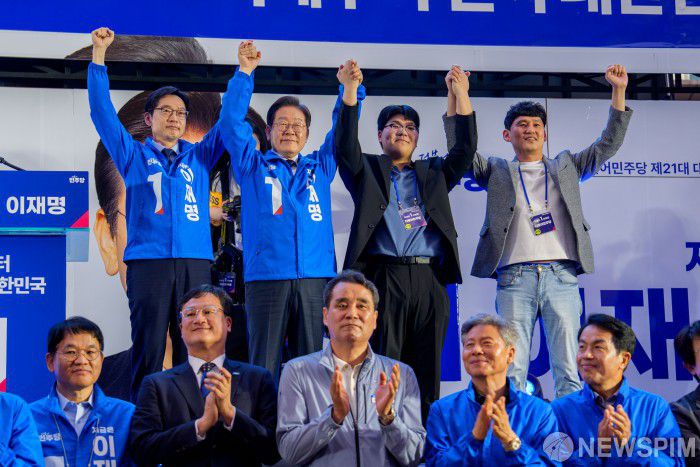 [울산=뉴스핌] 정일구 기자 = 이재명 더불어민주당 대선후보(뒷줄 왼쪽 두번째)가 13일 오후 울산 롯데백화점 광장에서 열린 집중유세장에서 김경수 전 경남지사(뒷둘 왼쪽) 등과 함께 손을 들어 지지자들에게 인사하고 있다. 2025.05.13 mironj19@newspim.com