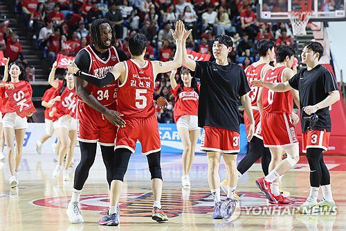 이느낌 그대로(서울=연합뉴스) 서명곤 기자 = 13일 서울 송파구 잠실학생체육관에서 열린 2024-2025 KCC 프로농구 챔피언결정전 5차전 서울 SK와 창원 LG의 경기. 서울 SK 김선형이 골을 넣은 뒤 자밀 워니와 함께 기뻐하고 있다. 2025.5.13 seephoto@yna.co.kr