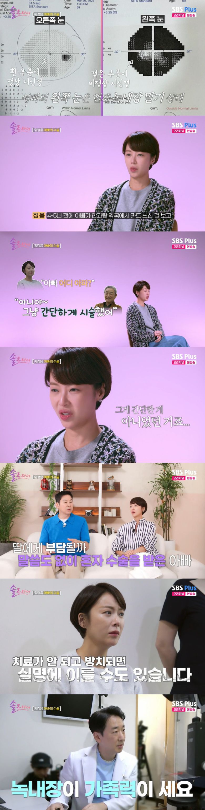 황정음 아버지의 왼쪽 눈은 현재 녹내장 말기 상태로, 의사는 "한쪽 눈에 녹내장이 있으면 언젠가는 반대쪽도 생길 가능성이 높다. 치료가 안 되고 방치되면 아예 안 보이게 될 수 있다"며 실명에 이를 수도 있는 심각한 상황을 언급했고, 아버지는 "선생님 말씀 듣고 하루도 안 거른다"고 답했다.