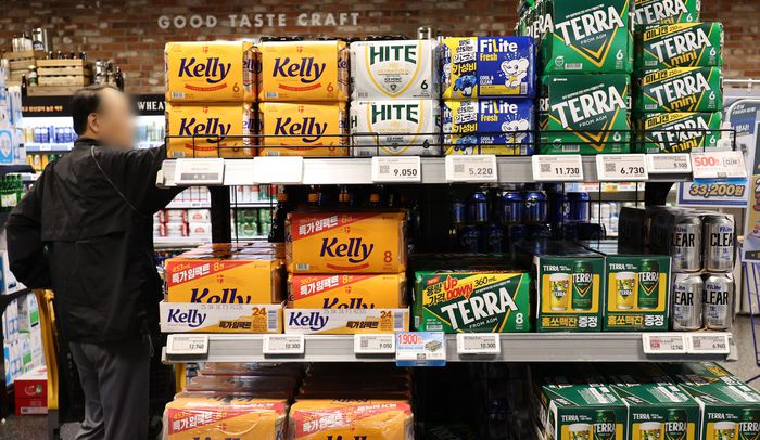 서울 시내의 한 대형마트에 하이트진로의 테라와 켈리 맥주가 진열돼 있다. [사진 출처 = 연합뉴스]