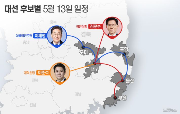 더불어민주당 이재명·국민의힘 김문수·개혁신당 이준석 후보가 13일 일제히 대구·경북(TK) 민심 쟁탈전에 나섰다. 주요 후보가 모두 TK로 발걸음을 향하면서 보수 민심에 작은 균열이라도 생기는 것 아니냐는 기대감과 우려가 교차한다.