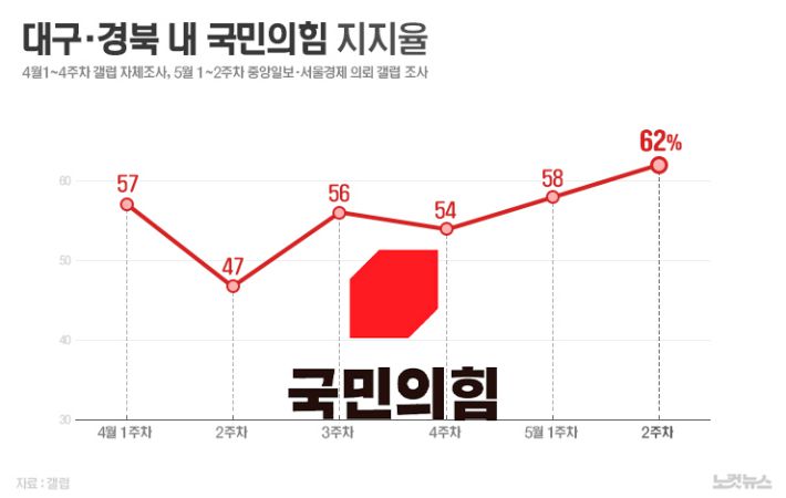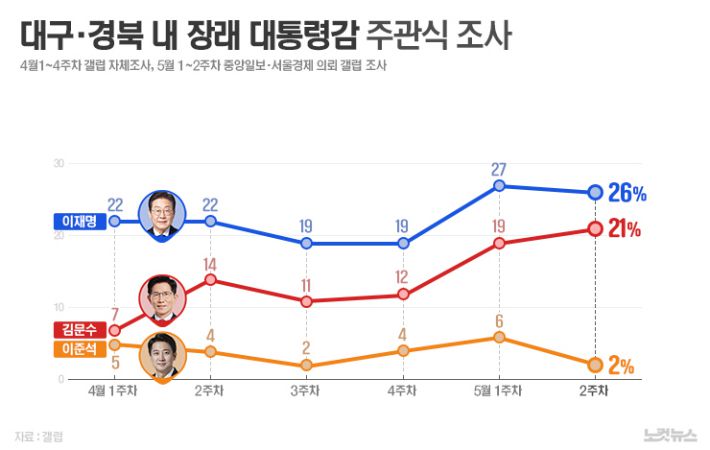 한국갤럽이 지난 4월1주부터 5월 2주까지 대구·경북 지역 유권자에게 물은 결과를 종합하면, 김 후보의 TK 지지율은 계속 이재명 대표에 뒤지고 있다(95% 신뢰수준에 표본오차 ±3.1%p, 자세한 내용은 중앙선거여론조사심의위원회 홈페이지를 참조).