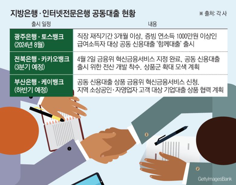 지방은행과 인터넷전문은행의 협업이 본격화한다. 연내 인터넷전문은행 3사 모두 모바일뱅킹 애플리케이션(앱)에서 지방은행과의 ‘공동 개인신용대출’ 서비스를 제공한다.