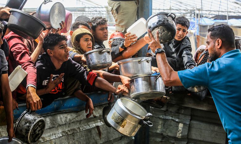 12일(현지시간) 팔레스타인 가자지구의 칸 유니스에서 주민들이 자선단체가 나눠주는 음식을 받기 위해 앞다투어 식기를 들이밀고 있다. 칸 유니스=UPI연합뉴스 |