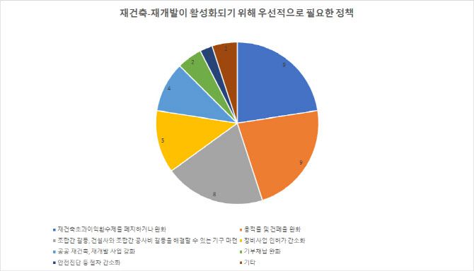 이데일리가 건설업계·학계·공무원 출신 등 각 분야의 전문가 20명을 대상으로 재건축-재개발이 활성화되기 위해 우선적으로 필요한 정책은 무엇이냐고 묻는 질문(중복응답)에 ‘재초환 폐지나 완화’와 ‘용적률 및 건폐율 완화’ 가 각각 22.5%의 응답률을 보였다.