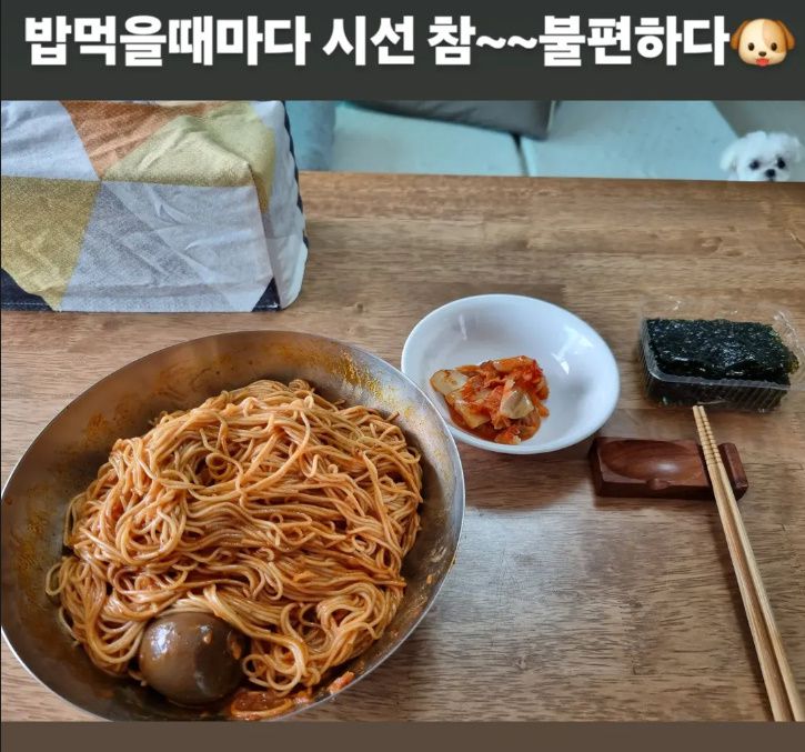 공개된 사진 속에는 비빔국수와 김치, 김, 젓가락이 가지런히 놓인 식탁이 담겨 있다. 무엇보다 눈길을 끄는 건 테이블 너머로 조심스럽게 고개를 내민 강아지 꽃분이의 모습이다.