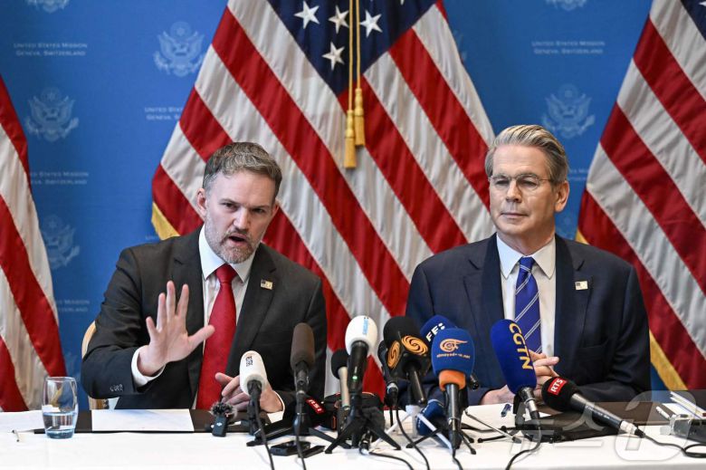 스콧 베선트 미국 재무장관과 제이미슨 그리어 USTR 대표가 12일 (현지시간) 스위스 제네바에서 열린 미중 무역 협상을 마친 뒤 기자회견을 하고 있다. 2025.05.13 ⓒ AFP=뉴스1 ⓒ News1 우동명 기자 |