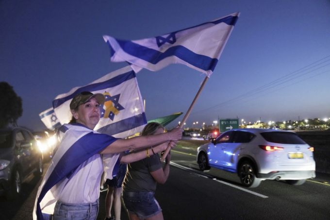 12일(현지 시간) 팔레스타인 무장 정파 하마스가 석방한 미국·이스라엘 이중국적 병사 에단 알렉산더가 탑승한 차량이 이스라엘 남부 레임의 군 기지에 도착하자, 미 뉴저지주 출신의 한 여성이 이스라엘 국기를 흔들며 그를 환영하고 있다. 알렉산더는 뉴저지 출신으로, 가자지구에 억류돼 있던 마지막 미국인 생존자로 알려졌다. /AP=뉴시스 |