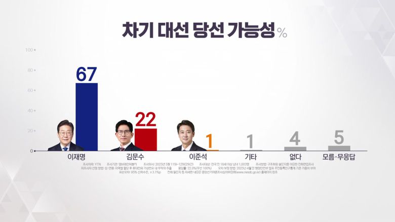 [YTN 여론조사 '민심을 읽다'] - 조사의뢰 : YTN - 조사기관 : 엠브레인퍼블릭 - 조사일시 : 2025년 5월 11일~12일(2일간) - 조사대상 : 전국 만 18세 이상 남녀 1,003명 - 조사방법 : 구조화된 설문지를 이용한 전화면접조사 - 피조사자 선정 방법 : 성·연령·지역별 할당 후 휴대전화 가상번호 내 무작위 추출 - 응답률 : 22.0%(무선 100%) - 오차 보정 방법 : 2025년 4월 말 행정안전부 발표 주민등록인구통계 기준 가중치 부여 - 표본오차 : 95% 신뢰수준, ±3.1%p - 전체 질문지 등 자세한 내용은 중앙선거여론조사심의위원회 홈페이지 참조