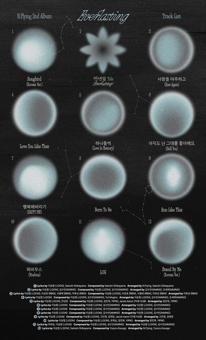 소속사 FNC엔터테인먼트는 13일 공식 SNS 채널을 통해 엔플라잉 정규 2집 ‘에버래스팅’의 트랙리스트 포스터를 공개했다. 포스터에는 밤하늘 위로 행성, 별, 눈꽃 등이 연상되는 아트워크와 곳곳에 멤버들의 별자리가 나타나 있어 낭만적인 분위기를 자아내고 있다.