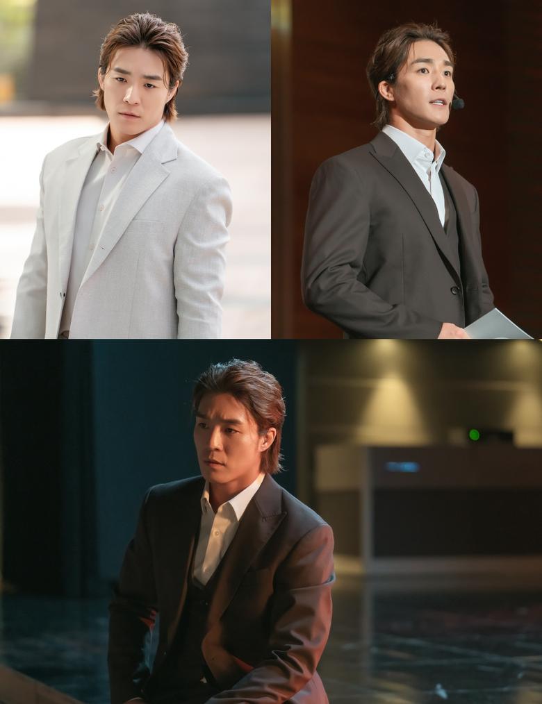 또 다른 스틸에서는 대한민국 최고로 꼽히는 민강유통의 신사업 총괄 책임자다운 포스를 확인할 수 있다. 한치의 흐트러짐 없는 수트 핏을 뽐내며 무대 위에서 위풍당당한 자태로 마이크를 잡고 이야기를 하고 있는 모습은 목표를 향해 거침없이 나아가는 그의 행보를 짐작하게 한다.