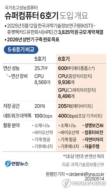 슈퍼컴 6호기는 엔비디아의 'GH200' 등 최신 GPU 8천496장을 탑재하며 600페타플롭스(PF, 1초당 1천조 번 연산 처리)급 연산성능, 205페타바이트(PB) 저장공간, 400Gbps(초당 기가비트) 네트워크 성능을 갖출 예정이다.